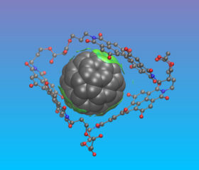 Our modelling provides insights into the possible structural arrangements of the complex and the interactions between host and guest molecules. The picture shows one possible binding mode, i.e., encapsulation, of the macrocycle fullerene complex (side chains of the macrocycle are omitted for clarity, contact surfaces are highlighted in green). The synthesis, characterization and modelling of the aggregate are carried out at FAU in a collaboration of the groups of Thomas Drewello, Andreas Görling, Dirk Guldi, and Maria Eugenia Perez-Ojeda.